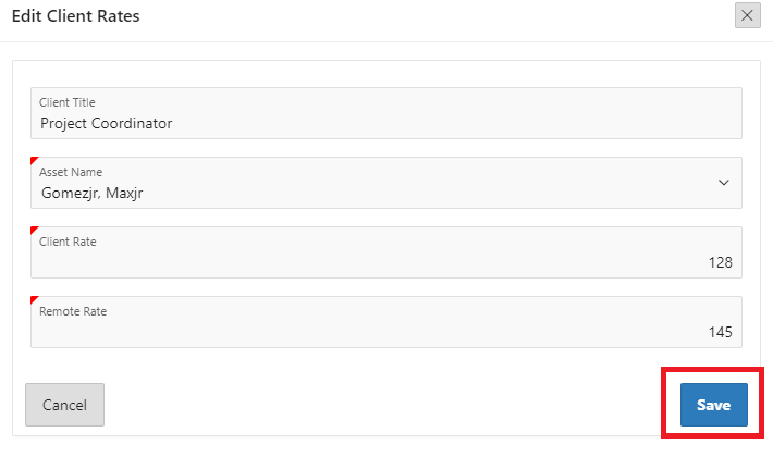 7. A new form will open, fill out the fields Client Title, Asset Name, client Rate, Remote Rate