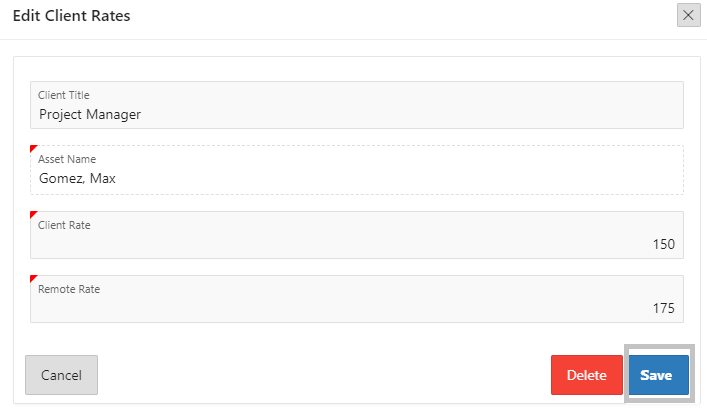 7. The form Edit Client Rates will open, after editing the necessary items, click the blue button Save